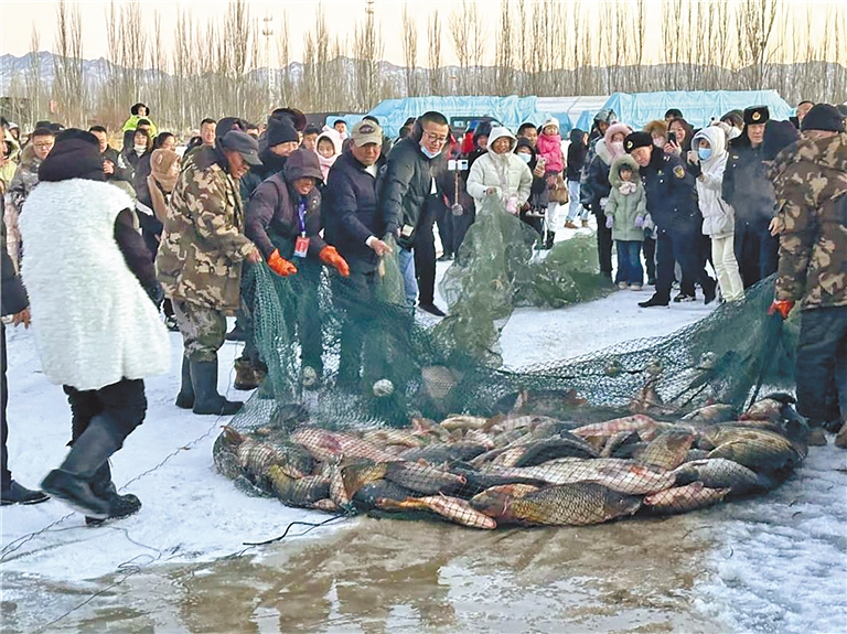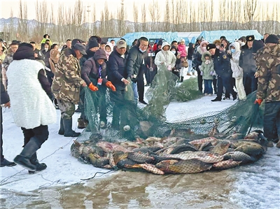 在冬捕现场,渔民带着捕捞工具凿冰、走网、收网,让游客现场体验壮观的冬捕景象。经过渔民1个多小时的辛苦劳作,乌梁素海冬捕喜获丰收。今年冬捕第一网捕获3000斤左右的鱼,其中有鲤鱼、草鱼、花鲢、白鲢等多个品种,头鱼重达25斤。