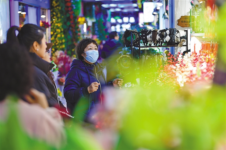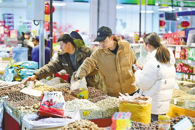 蔬菜瓜果、肉类海鲜、糖果干果等各类食品琳琅满目;春联、福字、大红灯笼等新春饰品营造出红红火火的节日氛围。丰富的年货承载着人们对美好生活的殷殷期盼。市民田女士提着刚刚购买的大红灯笼对记者说:“现在的年货种类越来越多,品质也越来越好了,买个红灯笼图个好彩头,希望日子过得红红火火。”