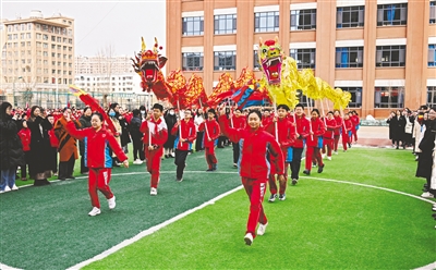 2月26日,呼和浩特市赛罕区锡林南路小学分校的学生们在开学典礼上带来了精彩的舞龙表演。当日,呼和浩特市中小学生迎来开学第一天,校园里再传朗朗书声。本报记者 王磊 摄