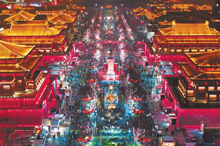 这是2024年2月2日拍摄的西安大唐不夜城景色(无人机照片)。走过不平凡的2023年,中国经济在砥砺奋进中迎来2024年新开局。开年以来,各地各部门抢抓机遇奋发作为,亿万人民同心协力,推动中国经济在高质量发展道路上坚定向前。经济回升向好势头明显,彰显我国经济韧性强、潜力大、后劲足,为加快形成新质生产力贡献力量。新华社记者 邵瑞 摄