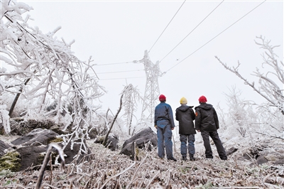 2月26日,在桂林市全州县东山瑶族乡,抢修队员利用无人机观察线路融冰情况。连日来,受冷空气影响,广西桂北高寒山区出现低温雨雪冰冻天气,导致电力线路覆冰,南方电网广西电网公司启动低温雨雪冰冻灾害Ⅲ级应急响应,及时组织电力抢修队伍,开展防冰抗冰应急处置工作,保障电网安全稳定运行和电力可靠供应。