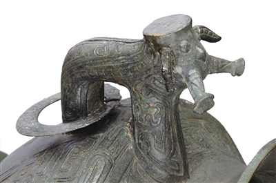在内蒙古博物院文明曙光展厅就有这样一件吉金——春秋夔纹龙耳套环青铜罍,是该院镇馆之宝之一。春秋夔纹龙耳套环青铜罍造型稳重,制作精湛,装饰精美,保存完好,是春秋战国时期游牧文化与中原农耕文化交流的实物见证。