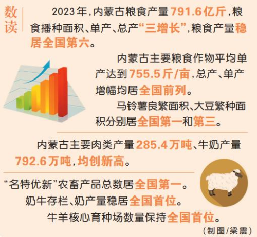 数字是发展最好的注脚。过去一年,内蒙古紧扣“地、水、种”和“粮、肉、奶”6个重点,全力推动粮食单产再提高、牲畜养殖再增效,不断扩大数量、提高质量、增加产量,努力把国家重要农畜产品生产基地建设得量大质优,切实当好国家粮食安全“压舱石”。