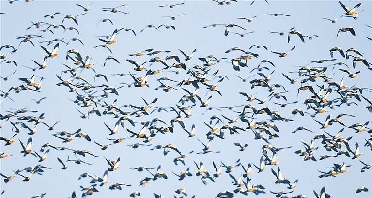 驱车进入乌梁素海景区,入口处新建的雕塑格外醒目。雕塑宽6.5米,高18米,底部有四片绿叶,中间的银柱上镶嵌着一颗金球,数只红色候鸟绕着银柱腾空而起。“雕塑于去年12月10日建成,绿色代表绿水青山,红色代表候鸟集群,银色和金色代表团结一致、久久为功、共同守护乌梁素海这颗‘塞外明珠’。”雕塑设计者陈海生说。