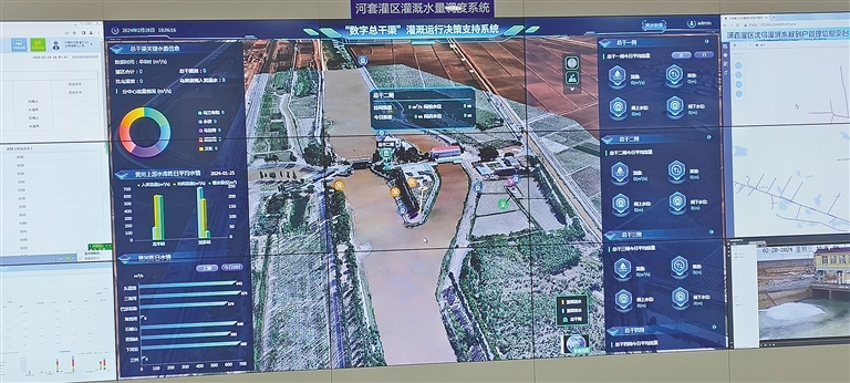 在河套灌区水量信息化监测中心50米长的数字屏幕上,“数字总干渠”灌溉运行决策支持系统只是其中一项内容,在这个数字屏幕上,还能看到黄河三盛公水利枢纽工程的实时画面、河套灌区渠沟道枢纽工程实时运行现状、总干渠5座枢纽工程运行情况视频、河套灌区水量调度系统、内蒙古黄河实时视频监控等各种实时监控画面和实时数据,先进的科技让人震撼。