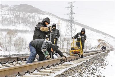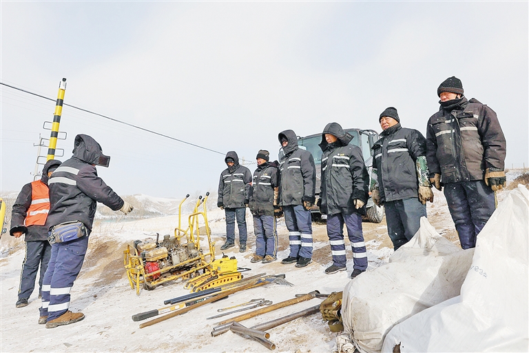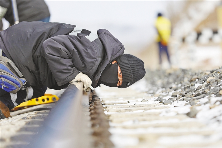 集通铁路是重要的铁路干线,日均通过50余列重载列车。在有限的维修窗口时间内,工人们要冒着寒风检修线路,在钢轨冻害低洼处插进垫板,以保证列车在这段铁路上平稳行驶。遇到作业空间小的情况时,工人常常需要摘下手套清理铁轨与地面缝隙间堆积的冰雪。检修过程中,他们坚持“标准化、精细化、零误差”的工作标准,严格执行回检流程,把线路几何尺寸控制在毫米范围内。引弹条扣压力是否达标、轨距块是否落槽等十几道作业程序,他们都会逐项确认完成。