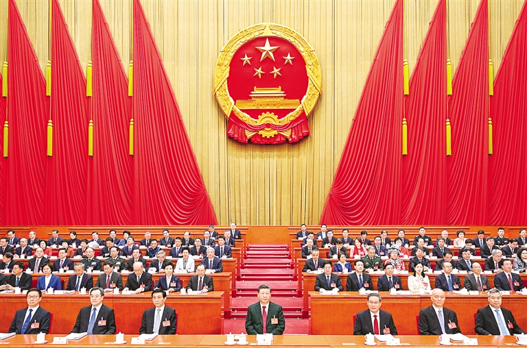 人民大会堂大礼堂气氛隆重热烈,主席台帷幕正中的国徽在鲜艳的红旗映衬下熠熠生辉。