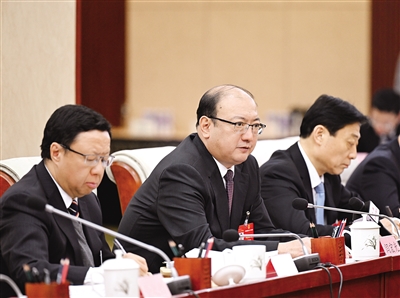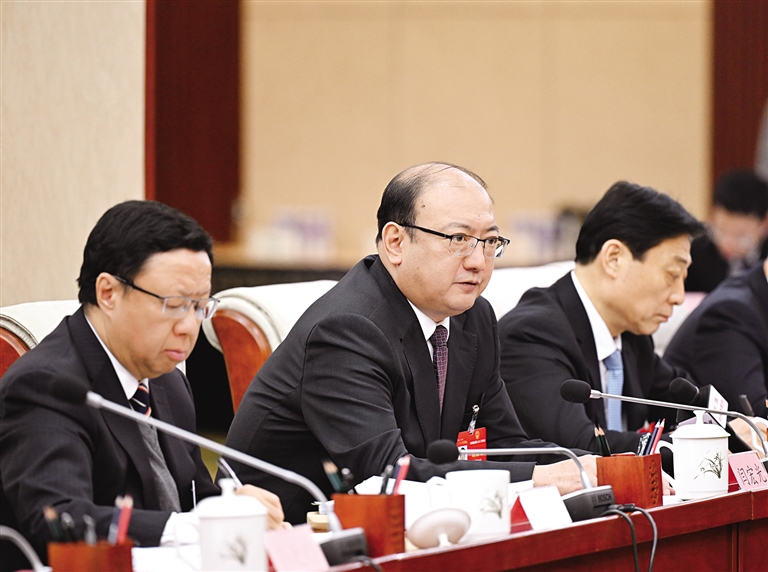 3月5日下午,全国人大代表闫宏光(中)在审议政府工作报告时建议,支持内蒙古多端直流工程尽快纳入国家电力发展规划。 本报记者 马建荃 摄
