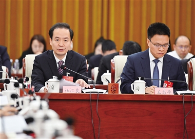 3月10日,在审议“两高”工作报告时,全国人大代表杜汇良(左)建议加强对全过程人民民主地方实践经验的总结推广,让全过程人民民主在促进基层治理、加强民生保障等方面发挥更大作用。本报记者 马建荃 摄