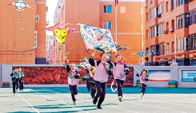 3月13日,呼和浩特市玉泉区恒昌店巷小学的学生在放飞风筝。当日,呼和浩特市玉泉区恒昌店巷小学开展“放纸鸢 享春光”主题活动,让孩子们体验运动乐趣,愉悦身心,感受明媚春光。本报记者 王磊 摄