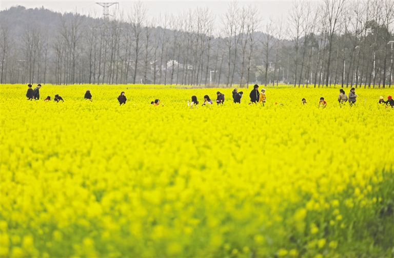 3月13日,游客在湖南省资兴市蓼江镇油菜花海赏景游玩。早春时节,阳光明媚,人们纷纷来到户外踏青、赏春,亲近自然,感受春天的气息。 新华社发
