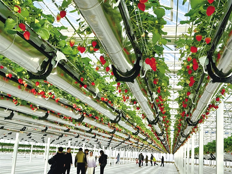 这几天,达拉特旗现代数字农业产业园,悬挂在2米多高的空中草莓,一排排数控化可升降草莓栽培床整齐排列,33万株草莓住上“电梯房”,采用可升降悬挂式培床系统进行复合密植种植,香甜气息弥漫,吸引了各地游客前来采摘、品尝。
