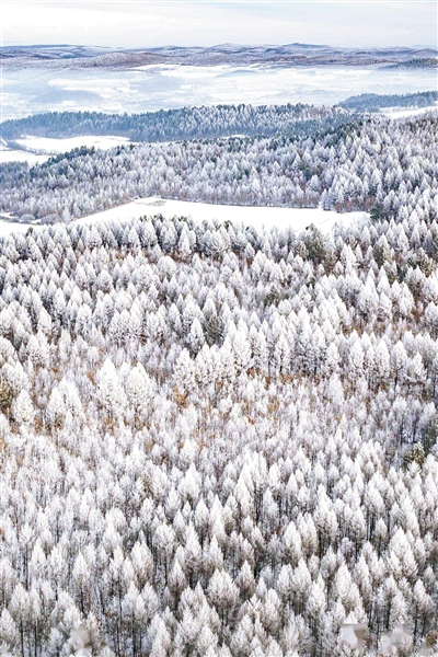 靛蓝色的黎明,点缀着隐隐的银光,雪如棉团,悬挂在万树的梢头,把交错的树枝塑造成凝固的林涛,腐殖质层的斑斓被落雪掩得均匀,只有河流如白龙蜿蜒,河面上裸露的冰块,偶尔眨眼似的一闪。苍穹像一位演出前的歌者,用沉默等待远方的阳光。