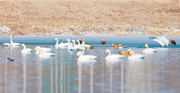 疣鼻天鹅、罗纹鸭、小天鹅等鸟类正在呼和浩特市大黑河戏水觅食,构成一幅美丽的生态画卷。近年来,随着呼和浩特市生态逐年改善,吸引越来越多的野生鸟类来此“做客”。