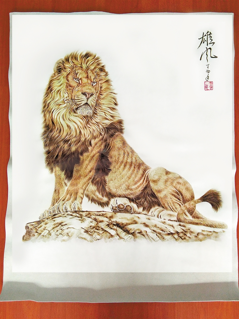 卢云山的烫画题材涉及花、鸟、人物等,他的牛皮烫画线条流畅,画面清晰,形象生动,充满动感和张力。