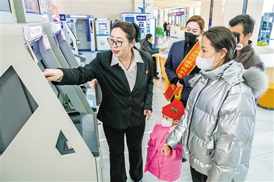 为深化坚强堡垒“模范”支部创建,呼和浩特市玉泉区行政审批和政务服务局在政务服务大厅设立“党员先锋岗”,帮助市民使用医保自助终端机,并围绕企业、群众需求,推进政务服务集成化办理,实现更多事项“网上办”“掌上办”“自助办”。丁根厚 摄