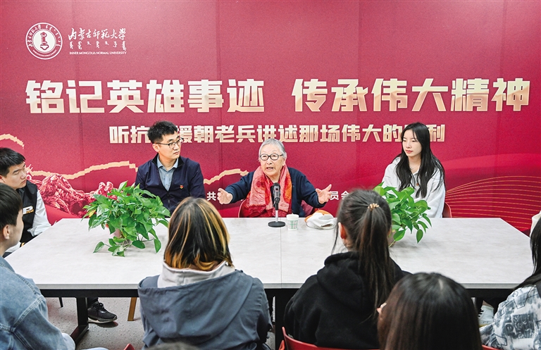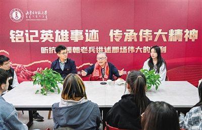 3月21日,90岁老兵付景彦为大学生们讲述抗美援朝亲身经历。当日,内蒙古师范大学开展“铭记英雄事迹 传承伟大精神”抗美援朝老兵讲那场伟大的胜利主题活动,将学雷锋志愿服务活动持续进行。现场,付景彦老人与团员青年学生面对面,号召大学生怀揣爱国情怀,为实现中华民族伟大复兴的中国梦而努力奋斗。 本报记者 王磊 摄