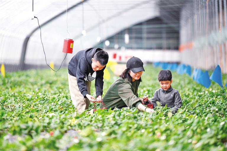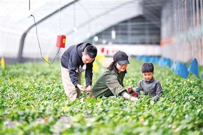 3月23日,小朋友和家长在位于呼和浩特市赛罕区金河镇的蒙游记田园综合体内采摘草莓。草莓甜蜜“上线”,迎来采收季,不少市民携家带口穿梭在草莓大棚内,尽享春日里的“莓”好时光。本报记者 王磊 摄