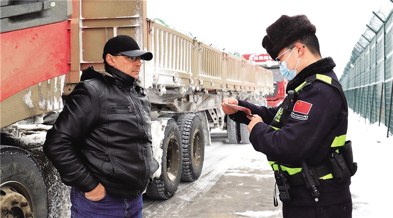3月23日,黑山头口岸民警对出入境车辆进行查验。当日,额尔古纳市迎来今年以来最强降雪天气,额尔古纳出入境边防检查站启动极端天气预案,通过增加巡逻频次、警车引导等方式确保口岸安全畅通。 本报记者 李新军 摄