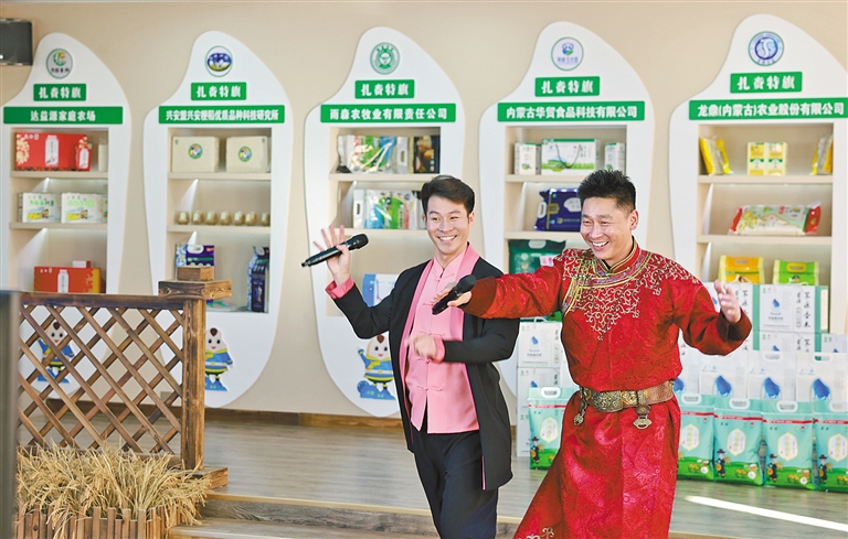 近日,兴安盟扎赉特旗乌兰牧骑党员志愿者借助农直播宣讲党的好政策,展示该旗农文旅融合新图景,同时推介扎赉特本土大米,以文化搭台,经济唱戏,助力当地百姓腰包鼓起来。苏晓东 摄