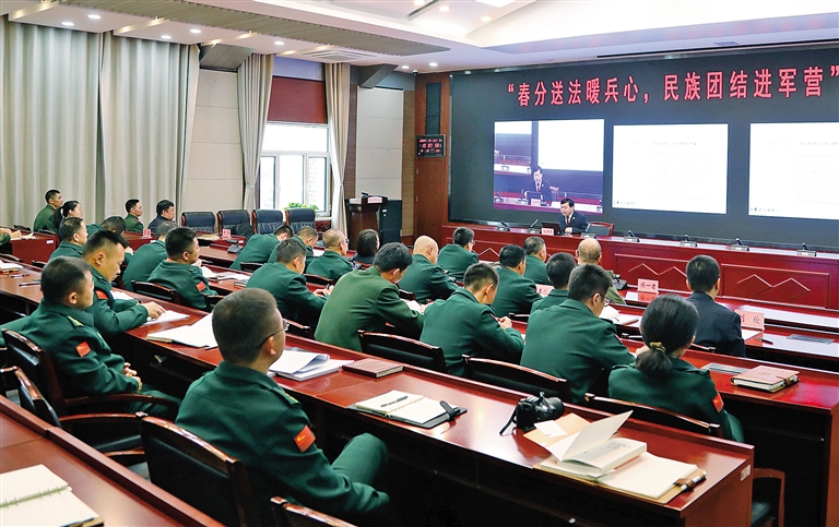 近日,呼和浩特市新城区人民检察院联合新城区民委、武警内蒙古总队呼和浩特支队共同开展“送法进军营”主题党日活动,为部队官兵送上了一场丰盛的民族理论、民族政策与法律法规“盛宴”。图为新城区人民检察院检察官为了顺应部队知法、学法、懂法需求,为部队官兵上了一堂精彩的法治课。