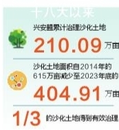 一代代治沙人,以年为单位,与“沙龙”在时空中进退斡旋。党的十八大以来,兴安盟累计治理沙化土地210.09万亩,沙化土地面积自2014年的615万亩减少至2023年底的404.91万亩,1/3的沙化土地得到有效治理。兴安盟也在书写“绿色奇迹”的过程中,打磨出了“从沙进人退到绿进沙退”的治沙经验。