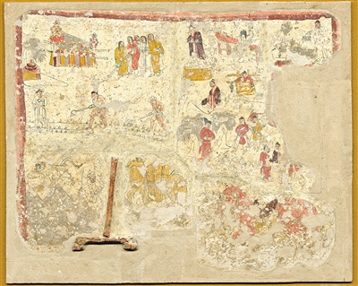M1墓室中还有《朱雀图》《狩猎图》《抚琴图》《钓鱼图》《人鱼图》《雄鸡图》《卧冰求鲤》《郭巨埋儿》等图。《朱雀图》中朱雀为凤首鹰爪,呈大鹏展翅之势,凸显出北方游牧部族把对鹰的喜爱和崇拜融入绘画的审美观。《卧冰求鲤》是传颂中国传统孝道文化《二十四孝》里的故事之一。画面中,一位上身赤裸的年轻人侧卧在冰面上,冰面下一条金黄色的大鲤鱼正欲跃出冰面;画面上方,一位年迈的妇人正在关切地遥望……这则典故讲述的是晋朝王祥寒冬腊月敞怀卧冰面,用体温融化坚冰,求得鲤鱼,救曾经苛待他的继母的感人故事。