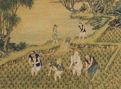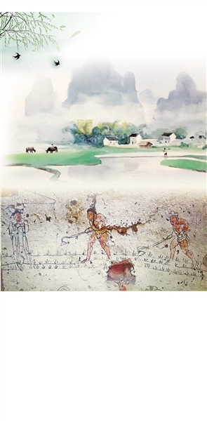 《耕作图》位于M1墓室西南壁的壁画第二层左侧。画面中,三条直线和一些倒“个”字勾勒出田地和庄稼的形状,重点笔墨落在3位耕作者身上,他们的神态、衣着、动作惟妙惟肖,由于长期劳作而隆起的肌肉,让人不禁联想到会有汗水顺势滑下。