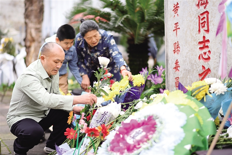 4月4日,石正祥(左)在贵州省黄平县旧州革命烈士陵园与烈属一起祭奠烈士。 当日是清明节,在贵州省黔东南苗族侗族自治州黄平县旧州镇东门村,62岁的石正祥把烈士陵园打扫得干干净净,以迎接前来缅怀和祭奠先烈的人们。 1985年,黄平县政府为王富海等烈士修缮了陵园。当时,石正祥的父亲石国民主动承担起为烈士守陵的义务。3年后,石国民弥留之际希望石正祥继承父志,继续为烈士守陵。接过守陵“接力棒”的石正祥牢记父亲嘱托,年复一年、风雨无阻地守护烈士陵园。石家两代人为烈士守陵已超过39载。2021年9月,石正祥入选中央文明办发布的“中国好人榜”。 新华社记者 杨楹 摄