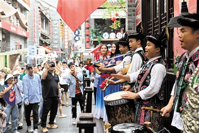4月13日,演员在广西南宁市三街两巷表演节目。连日来,广西各地举办形式多样的文化活动,欢庆“三月三”传统佳节,多姿多彩的民族文化吸引游客前来观看。 新华社记者 陆波岸 摄