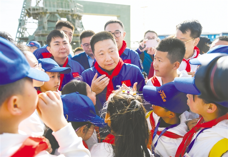 4月24日,中国载人航天工程副总设计师、航天英雄杨利伟在给少先队员们讲述当年执行载人飞行任务的过程。当日,全国少工委联合中国载人航天工程新闻宣传办公室等单位在中国酒泉卫星发射中心东方红卫星发射场举行“红领巾爱祖国——我心中的五星红旗”主题活动。活动现场,“七一勋章”获得者卓嘎,“时代楷模”央宗等戍边守边英模代表为内蒙古、甘肃、四川等地的少先队员讲述“我心中的五星红旗”的故事。活动期间,少先队员们还参观了发射塔架、地下指挥控制室、东方红历史展览馆,了解一代代航天人为了祖国航天事业接续奋斗的航天精神。本报记者 康丽娜 孟和朝鲁 摄