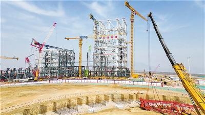 在内蒙古能源集团金山热电厂三期项目施工现场,各类大型机械正在作业,1500余名施工人员在各个作业面开展工作。金山热电厂三期项目建设2台100万千瓦高效超超临界空冷燃煤供热机组,投产后可实现年发电量100亿千瓦时,为蒙西网最大出力机组。供热面积5000万平方米,可向呼和浩特城区输送每小时1200吨工业蒸汽,年实现利税3.9亿元。
