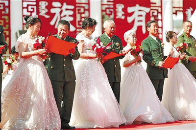 交换戒指、颁发婚书……25对退役军人夫妻走过幸福拱门,缓缓入场,他们互许爱的誓言,重温美好幸福时光。新娘身穿洁白的婚纱,脸上笑靥如花;新郎身着军装,英姿飒爽。现场工作人员将一本本装满了甜蜜与幸福、承载着一生一世承诺的红色结婚证颁发至每一对新人手中。