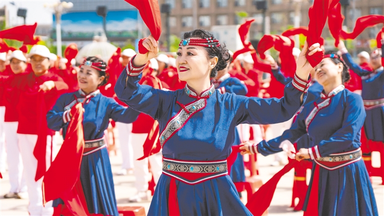 4月27日,2024呼和浩特市“文明有我 舞动青城”广场舞大赛启动仪式在新华广场举行。来自全市各体育协会、体育俱乐部、社区健身站点1500余名健身爱好者以舞会友,表演了精彩纷呈的舞蹈节目,展示了首府文明和谐新形象和新时代青城人民昂扬向上的精神风貌。 本报记者 韩晓宇 摄