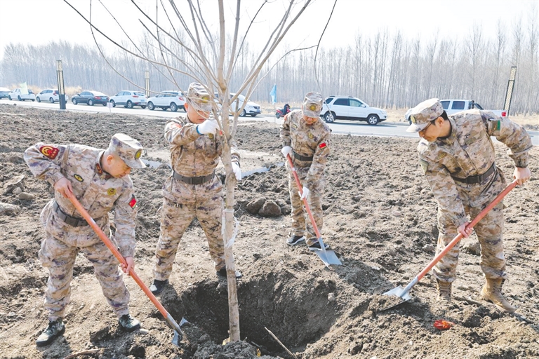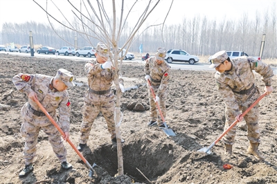 春来风光好,植树正当时。连日来,内蒙古军区各级组织官兵、文职人员和民兵开展植树治沙活动,播撒绿色、播种希望。