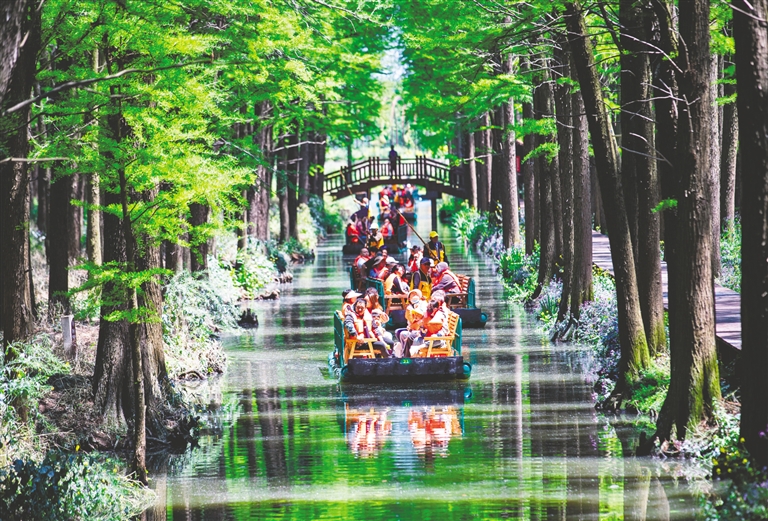 5月1日,游客在江苏兴化里下河国家湿地公园乘坐木筏游玩。“五一”假期,人们走出家门,尽享多姿多彩的假日美好时光。 新华社发