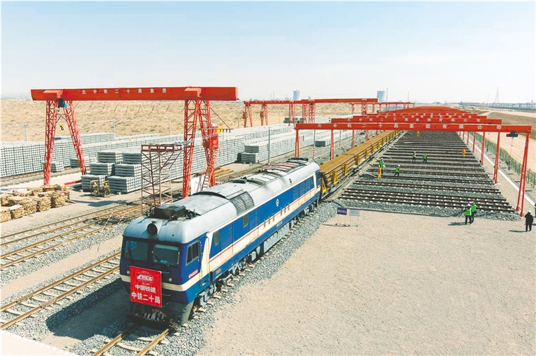 “五一”假期首日,一列满载500米长钢轨的列车顺利抵达包银高铁碱柜铺轨基地,实现了首列长轨安全进场的目标。这标志着中铁二十局集团承建的包银高铁标段正式进入长轨存储阶段,为将要启动的铺轨施工奠定了基础。 本报记者 郝飚 摄