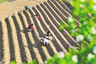 5月4日,山东省青州市庙子镇农民在栽植地瓜。立夏节气临近,各地农民抢抓农时开展各项农事活动,田间、地头一片忙碌景象。新华社发