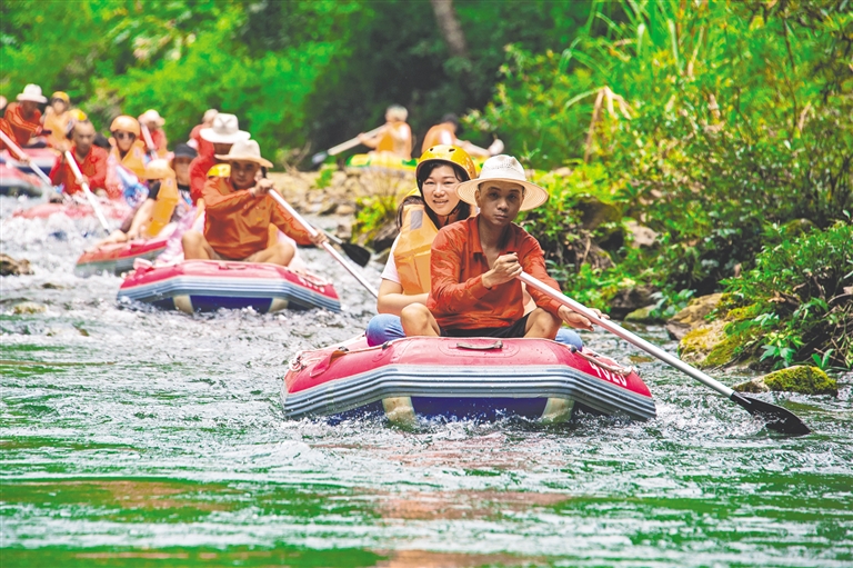 5月4日,游客在位于广西靖西市的古龙山峡谷群风景区漂流。五一假期,各地秀丽的风光和多彩的活动吸引游人纷至沓来。 新华社发
