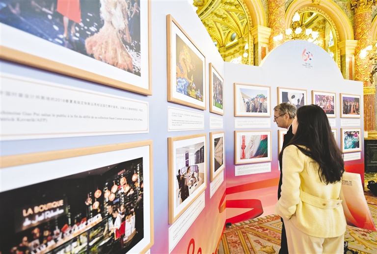 5月4日,人们在展览上参观。当日,“守正创新 继往开来——庆祝中法建交60周年图片展”在法国巴黎举办。 新华社记者 连漪 摄