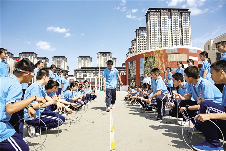 5月6日,呼和浩特市第三十九中学金地校区的中学生练习滚铁环。据了解,为助力“双减”政策落地落实,丰富校园文化生活,发展学生的兴趣与特长,该校开展了足球、篮球、羽毛球等形式多样的体育社团活动,还有滚铁环、跳皮筋等传统体育项目,受到了学生们的热烈欢迎。本报记者 王磊 摄
