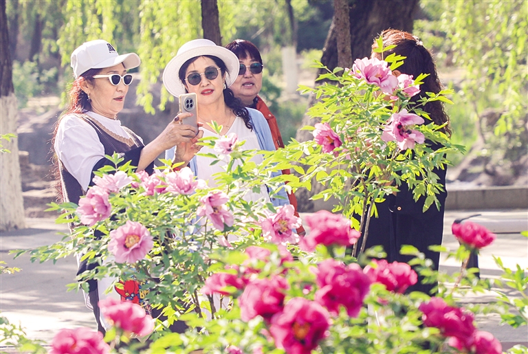 5月6日,市民在呼和浩特市满都海公园内观赏牡丹。初夏时节,满都海公园有各色牡丹花竞相绽放,吸引了游客、绘画和摄影爱好者前来观赏、拍摄。