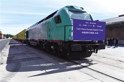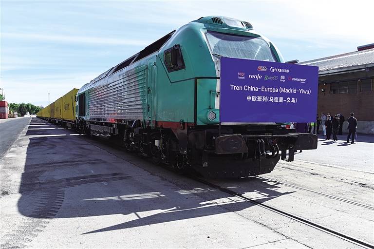 5月8日,在西班牙马德里,中欧班列(义乌—马德里)开行十周年纪念号班列准备发车。当日,中欧班列(义乌—马德里)开行十周年纪念号班列发车仪式在西班牙首都马德里举行,百余名嘉宾参加发车仪式并参观班列开行十周年成果展。该纪念号班列8日从马德里鸣笛发车,驶往中国义乌。 新华社发