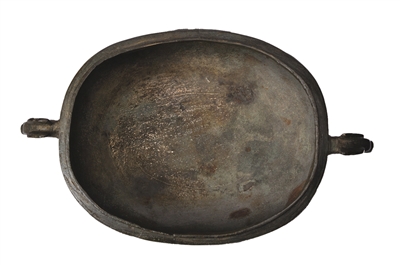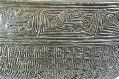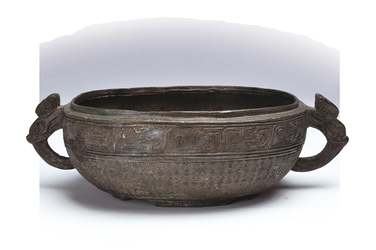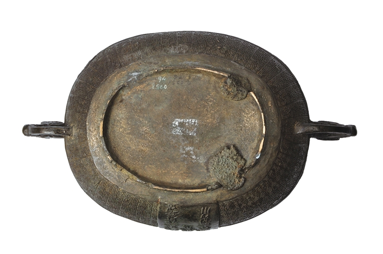 铜簠腹部的纹饰与宋徽宗有关。商周时期,寓意为取之不尽、用之不竭的回纹是礼乐重器上常用的纹饰;连续不断的回旋式线条图案云雷纹有绵延不绝和生生不息之意,在古人心目中是地位和神灵的象征。《论衡》记载:“云雷在天,神于百物。”云雷纹在商周时期的青铜器上也是常见的纹饰。