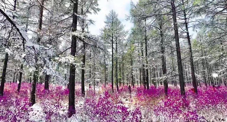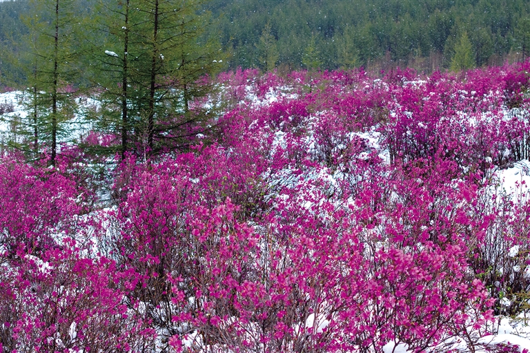5月的阿尔山,皑皑白雪尚未融尽,野生的杜鹃花却已是漫山遍野一片嫣红。