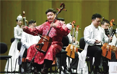 崔逢春创作的《那达慕序曲》原为铜管五重奏,采用了回旋曲式结构,以一种交响音画的形式描述那达慕的盛况,有惊险刺激的赛马、摔跤、令人赞赏的射箭;有争强斗胜的棋艺,引人入胜的歌舞。此次上演的《那达慕序曲》经乐团二次改编,将传统民族乐器与现代西洋乐器相结合,使得这一作品展现出更加丰富的音色和表现力。四胡与乐队《四海歌》则是一首充满地域特色的作品,为三段式结构。四胡作为蒙古族的传统乐器,其独特的音色和演奏方式赋予了这首乐曲独特的风格。蒙古族青年四胡演奏家苏雅在演绎过程中,充分利用了四胡这一乐器音色的特点,将高音四胡与低音四胡交替使用,展现出丰富的音域层次,与管弦乐队合作使音乐作品更具有立体感。
