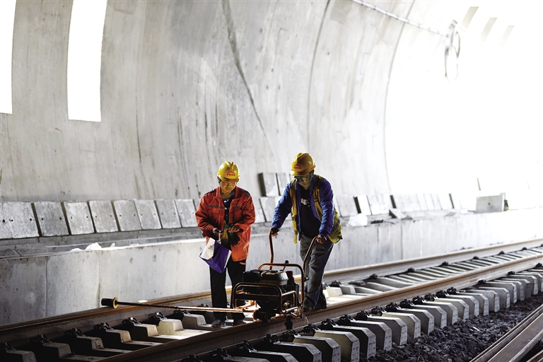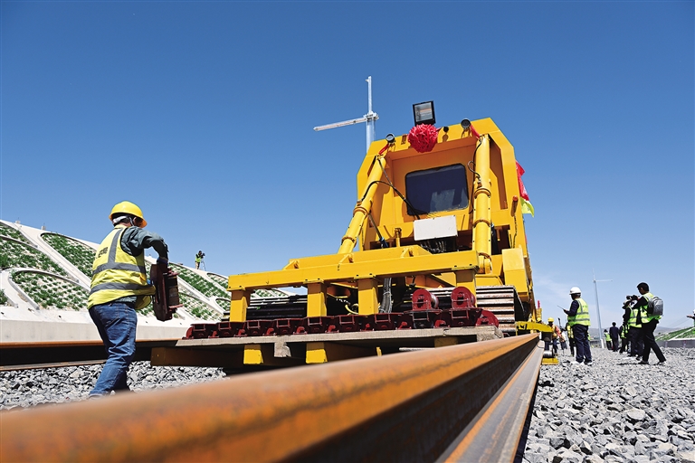 “此次铺轨作业采用自主研发的CPG500型铺轨机铺设长轨,可将500米长轨、轨枕一次性铺设到位,然后直接进行上砟整道、焊轨放散等作业,具有人工和交叉施工作业少、机械化程度高、铺设精度高、工效高等优势,能够有效保障铺轨施工安全高效。”中铁四局集大原高铁铺轨分部项目经理王仕瑜介绍。