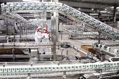 透过生产车间玻璃,“科技感”十足的生产场景映入眼帘。在这里,经过标准化处理、超高温灭菌、无菌灌装等环节,一盒盒精装纯牛奶从生产线下线,并从兴安盟奶源地发往全国各大商超。