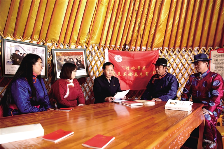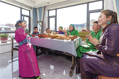 在科右前旗满族屯满族乡特布格日乐嘎查抵边牧户山丹家,院里五星红旗迎风招展,500平方米的标准化养殖圈舍干净宽敞,房子一旁安装了光伏板,一旁竖起的风车劲头十足地旋转。屋内炉火旺盛,温暖而舒适,奶茶的香气扑鼻而来,令人陶醉。