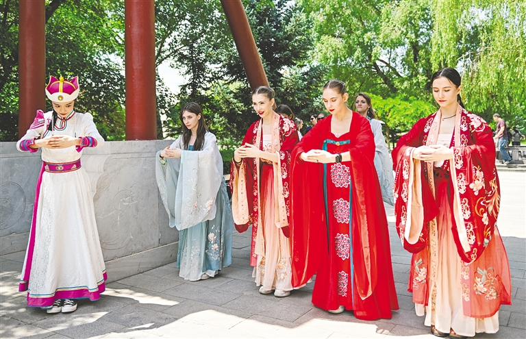 6月3日,俄罗斯国家古典模范芭蕾舞团的演员身穿汉服在昭君博物院感受中华传统文化魅力。当日,俄罗斯国家古典模范芭蕾舞团文化艺术交流活动在呼和浩特市昭君博物院举行。本次活动,以文艺演出、文化展示的形式架起了文化交流的桥梁。本报记者 王磊 庄圆 摄